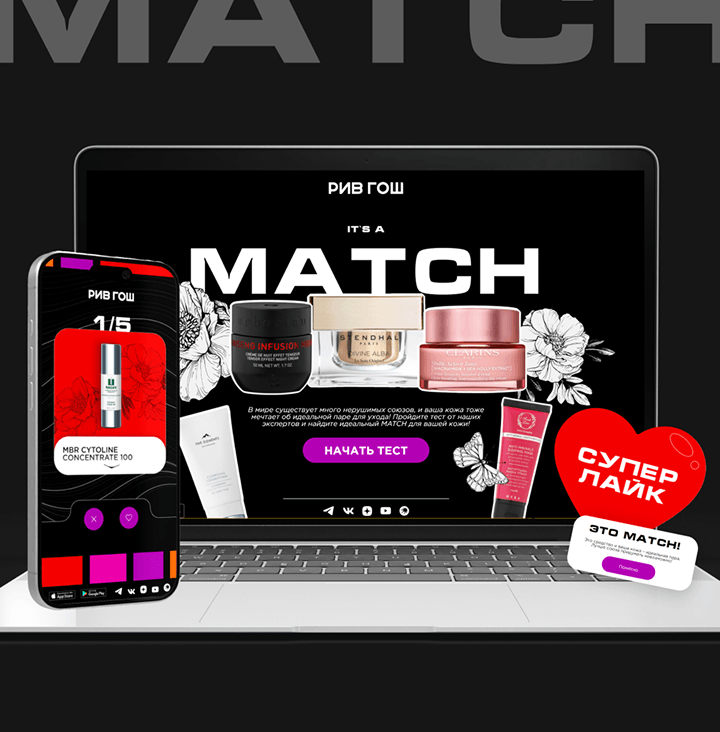 The main goal of the "Riv Gosh" landing page was to engage users in the promotion and provide personalized skincare recommendations. To achieve this, a quiz mechanic was used, allowing each user to take a short test and receive a selection of cosmetic products tailored specifically to them.