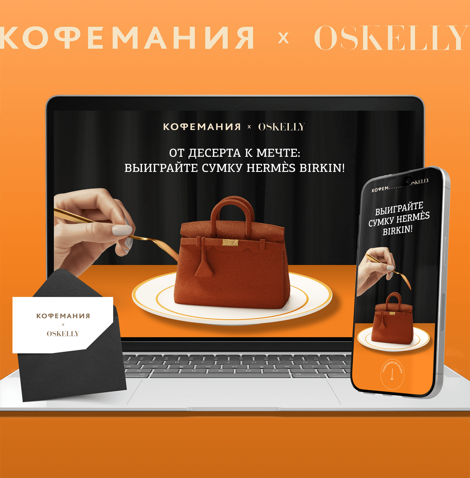 - 4 prize types with different distribution algorithms: 5% promo code, 10% promo code, 200 "Кофемания" (Kofemania) points, main prize — an invitation to the Hermès Birkin bag draw.