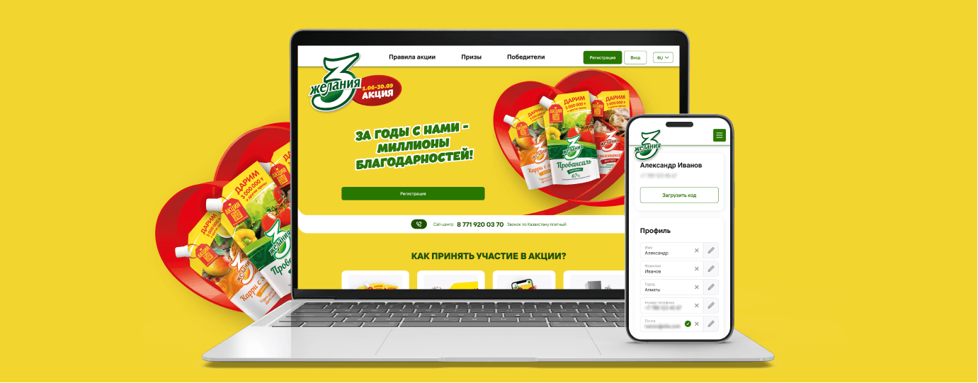 Development of a promotional website for a code-based campaign of the “3 Wishes” sauce brand in Kazakhstan to boost sales and customer loyalty.